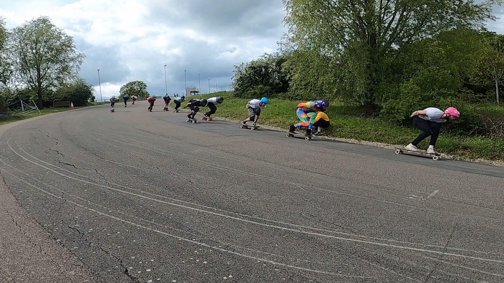 On arrival, it is good to see some old faces, many of which I haven't connected with in person for over 18 months (somehow facebook cannot compensate for seeing someone face to face). There are loads of new people too. Although there is no racing this weekend, the plan is two days of free-riding. There is a dance jam, a slide jam and slalom, as well as streetluging and downhill on the main track. Specifically, I intend to try out my new skateboards (the Swift and the Swallow) as well as three potential new luge designs. I am delighted with the results, especially my four wheel zero rear angled set up for the street luge (which sounded great to me in theory when I decided to build a prototype in my workshop, but I am glad to confirm that in reality, it can cope easily with the chicanes at full speed).
